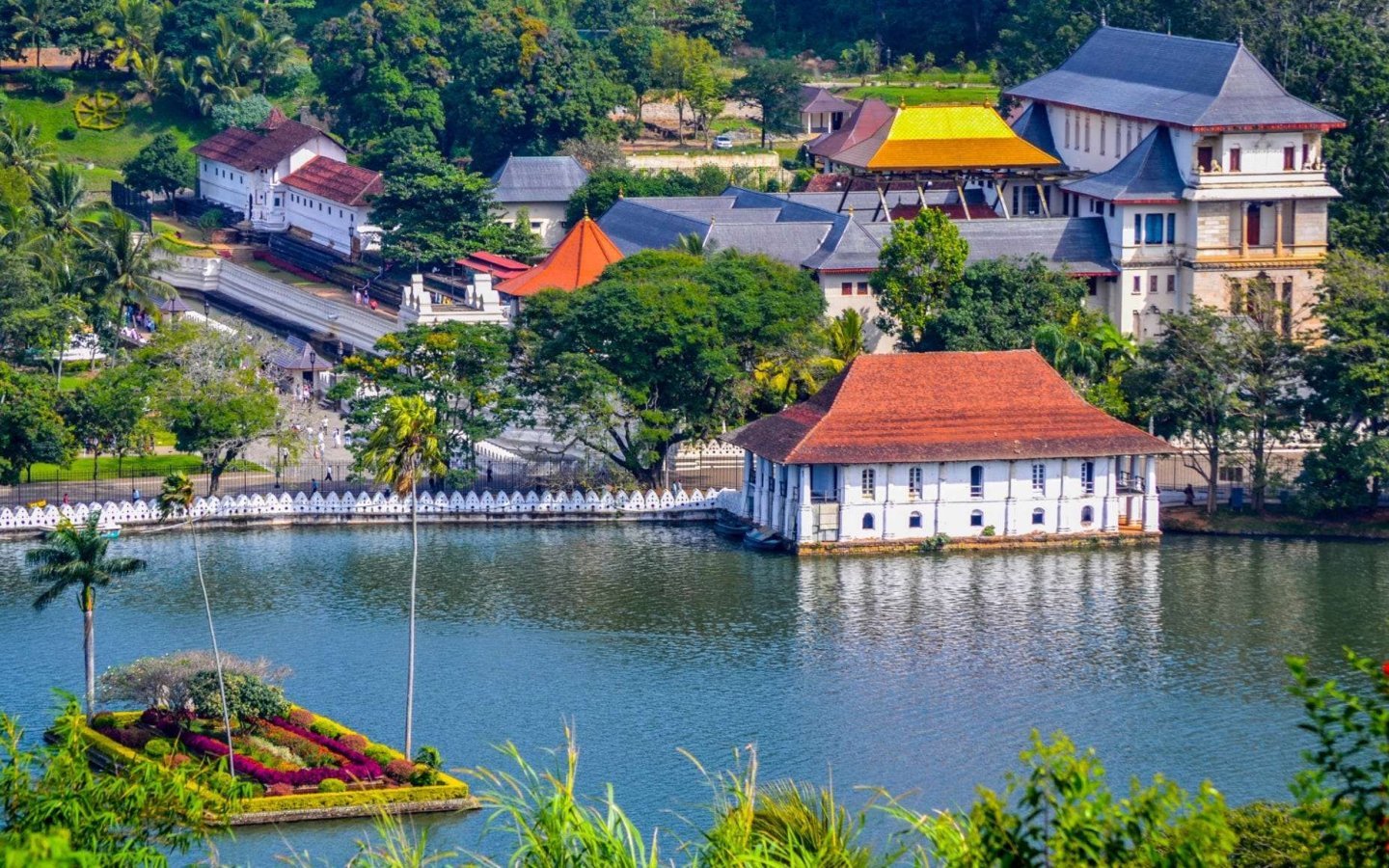 Surrounding the Temple of the Tooth is the serene Kandy Lake, a picturesque body of water ideal for leisurely walks. Visitors can enjoy a stroll along the lake's perimeter, taking in the tranquil views and the backdrop of lush hills. The lake also hosts swans and other bird species, making it a peaceful retreat in the heart of the city.